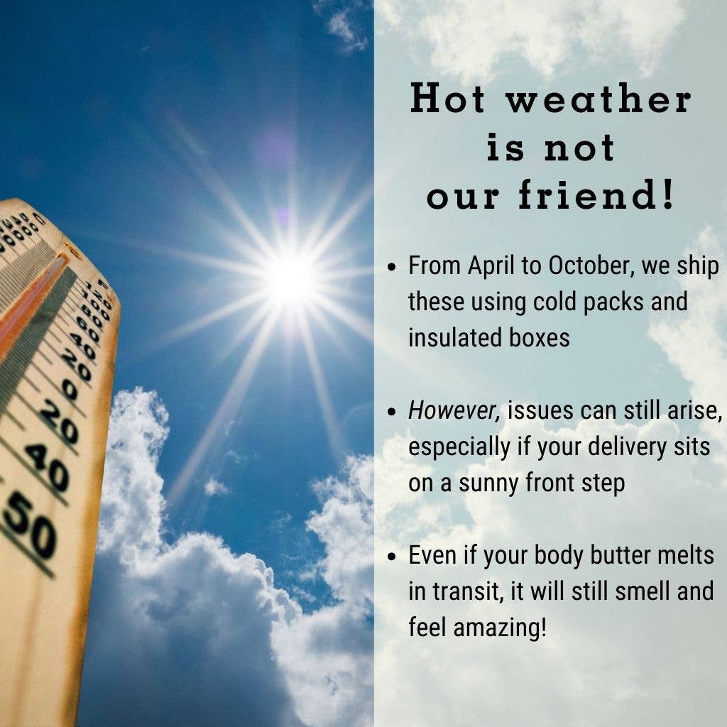 - Ingredients: Whipped shea butter, coconut oil, sunflower oil, mica, fig extract, honey extract, vanilla & black pepper essential oils