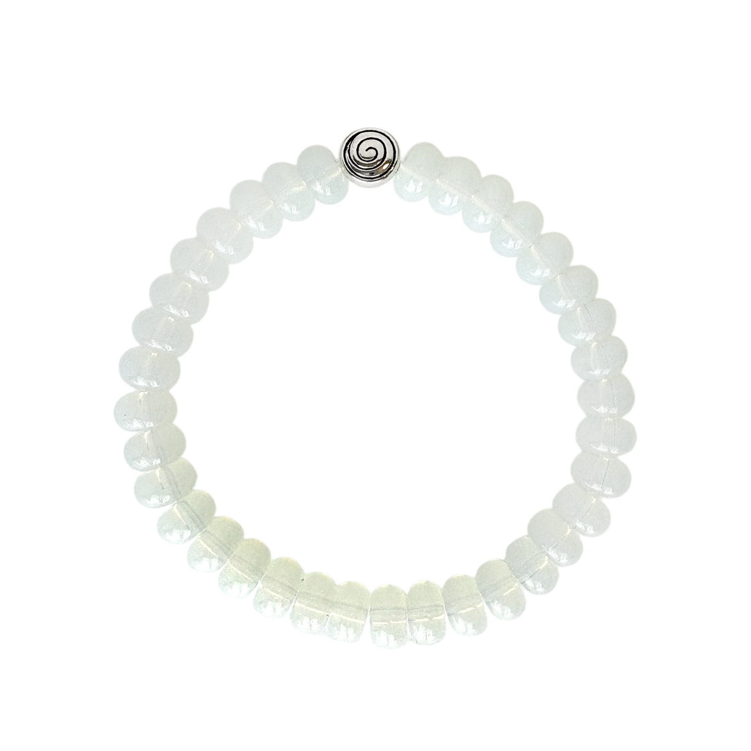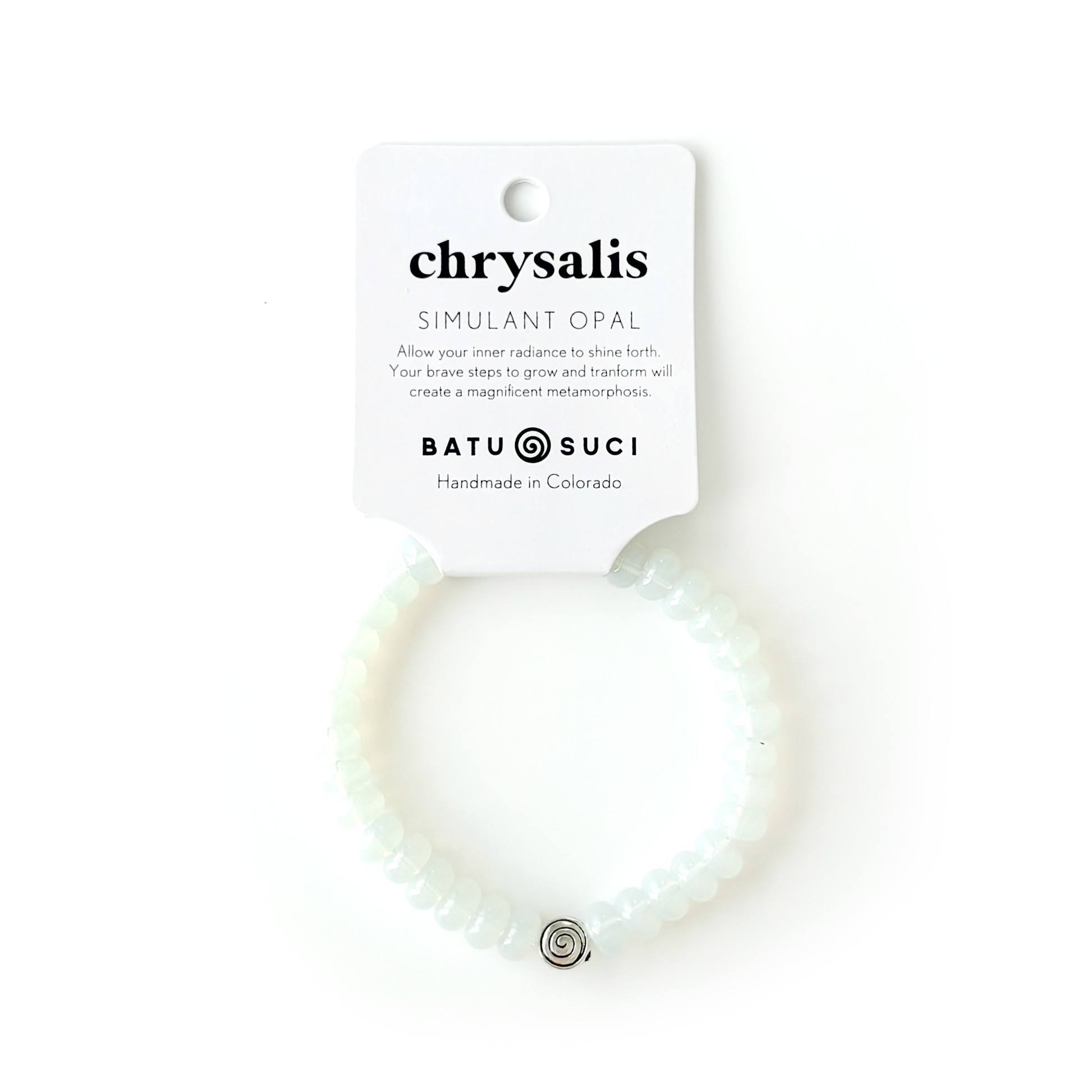Like the butterfly it honors, this opal rondelle bracelet symbolizes radiant transformation. Strung on a stretchy cord with a silver-plated accent bead, it fits 6–7" wrists. Handmade in Colorado.
