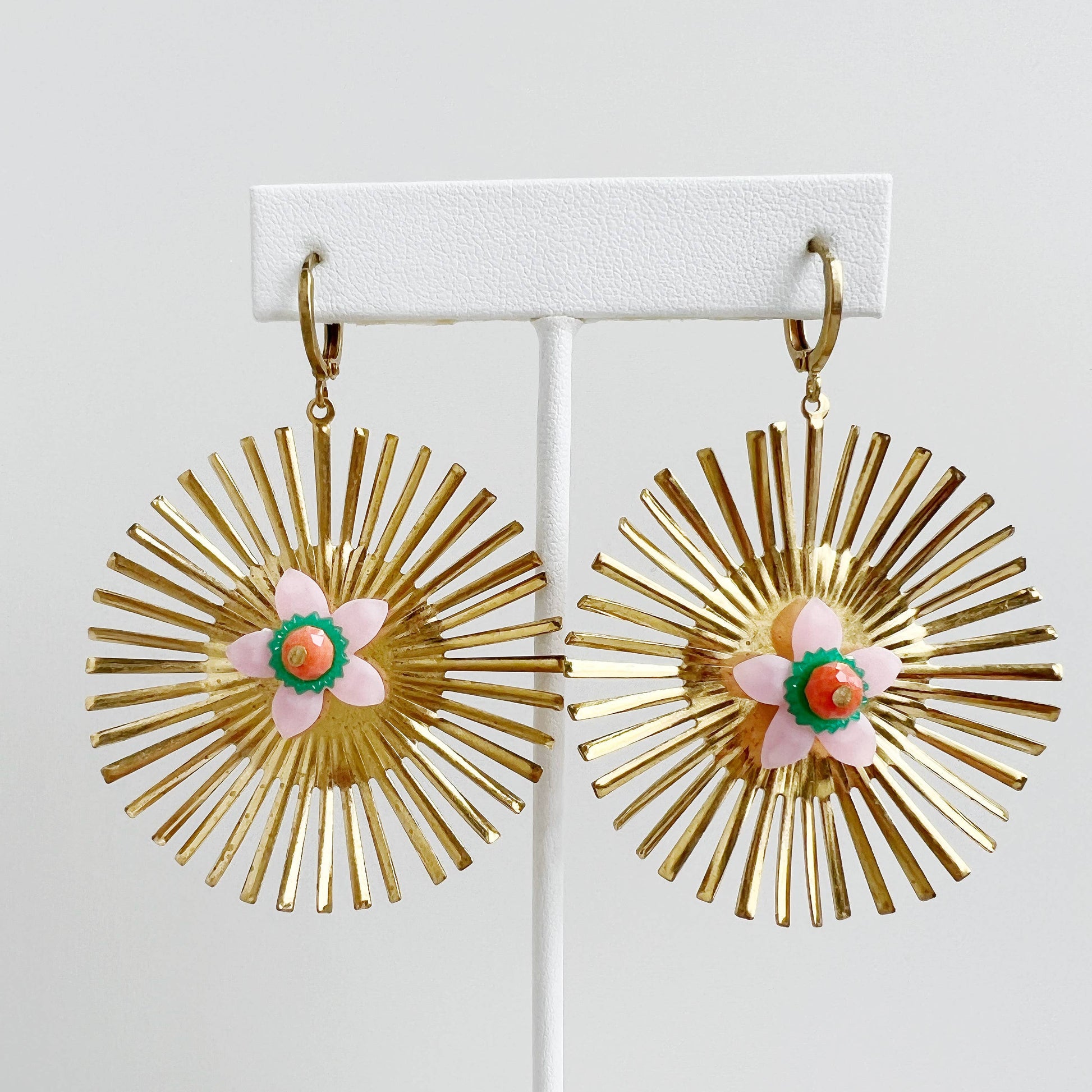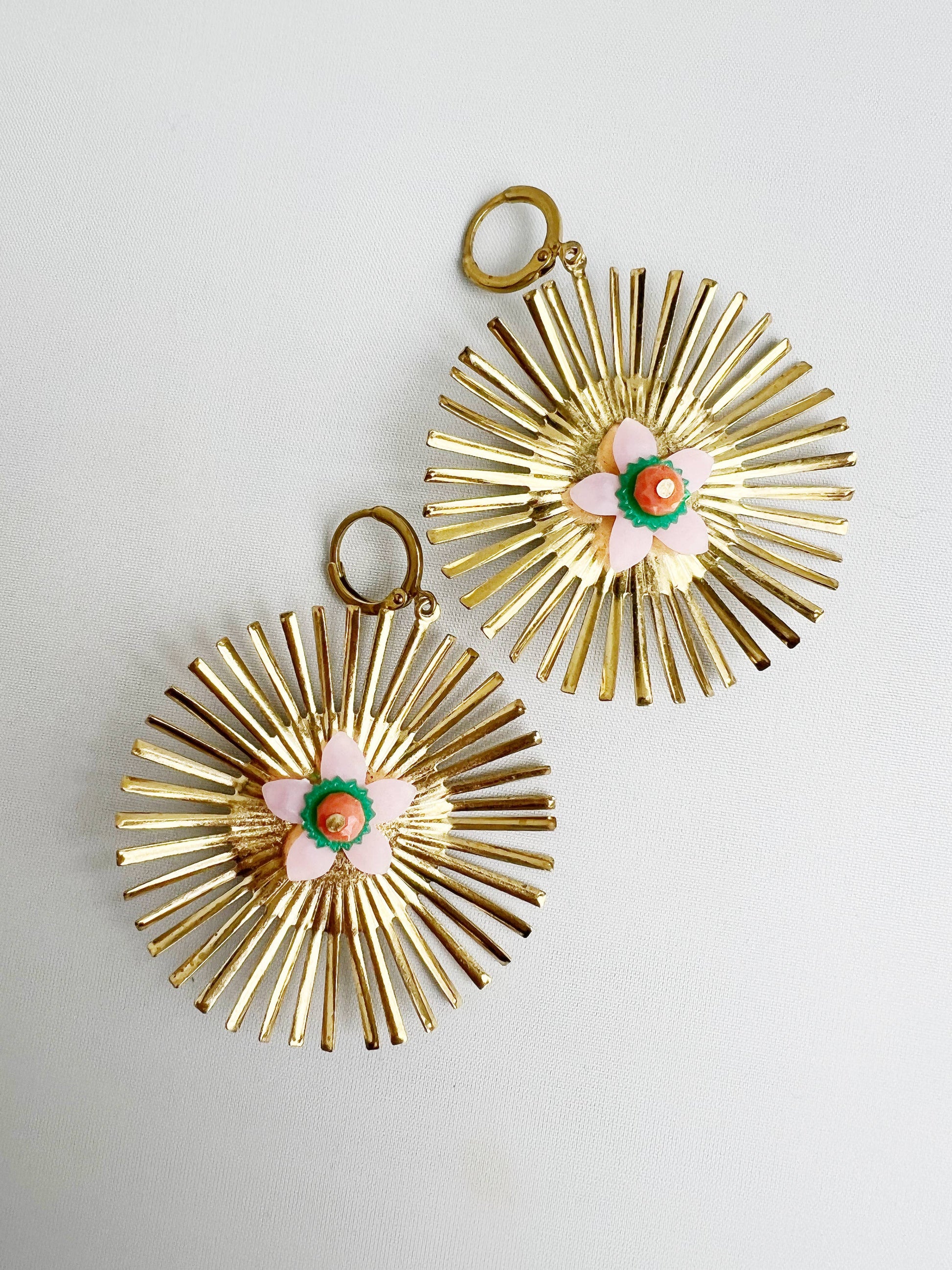A playful pink bloom reimagined. This vintage-inspired brass and floral component earring is a punch of bold femininity, perfect for the midlife muse who delights in both sweetness and edge.