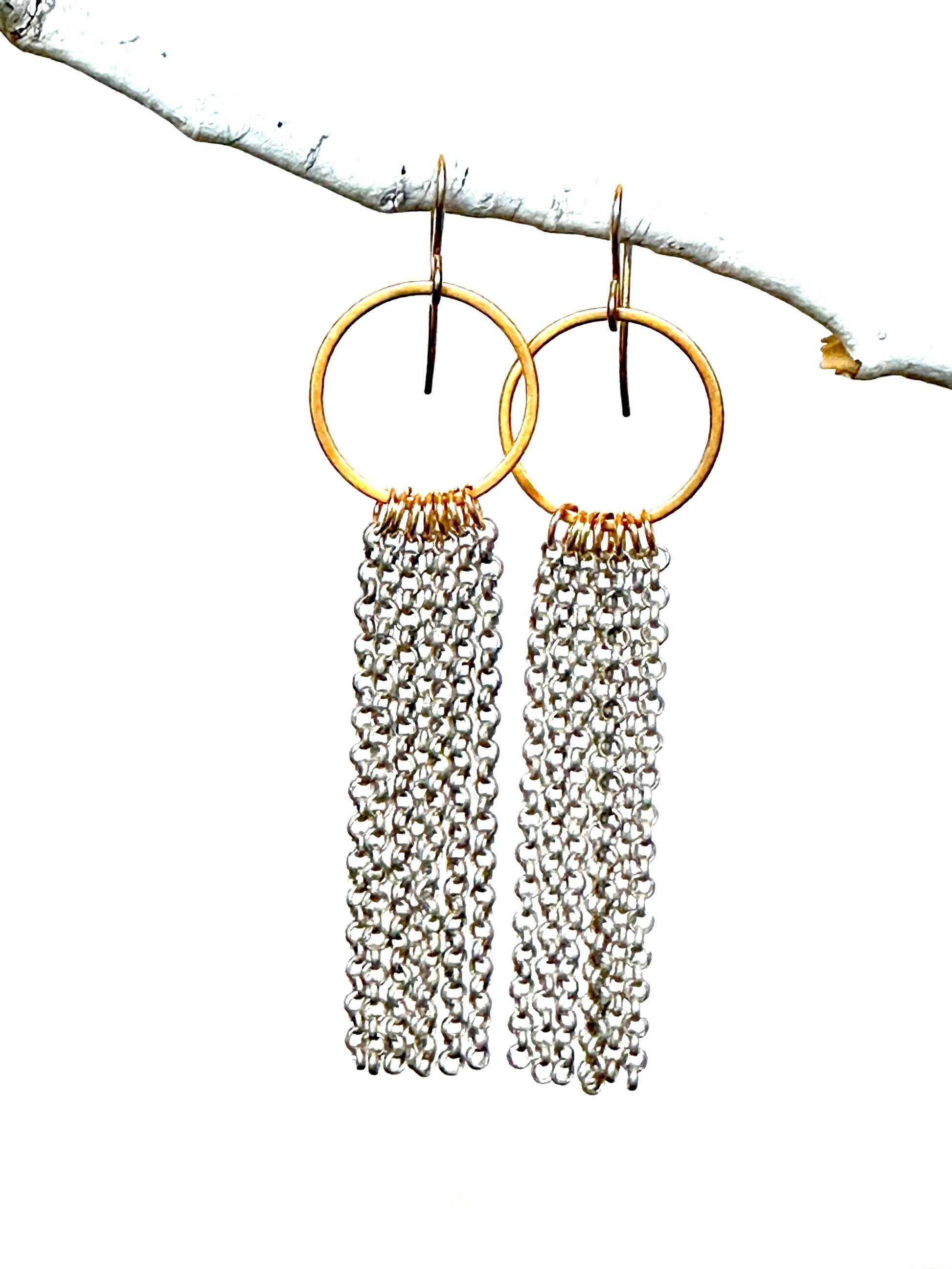 Silver chain tassels cascade 2¼" from a 16k gold-plated circle, with 14k gold-filled ear wires. Lightweight, eye-catching, and made to move—wear with strong opinions and a knowing smirk. Pair with messy hair, strong opinions, and a smirk that says, I know exactly who I am.