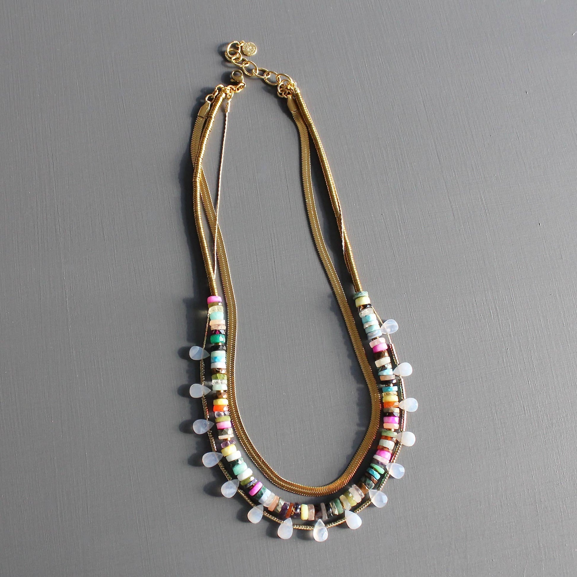 With matte gold herringbone and snake chains, agate teardrops, stone discs, and hematite, this necklace layers color, texture, and soul like a well-traveled woman telling her favorite tale.