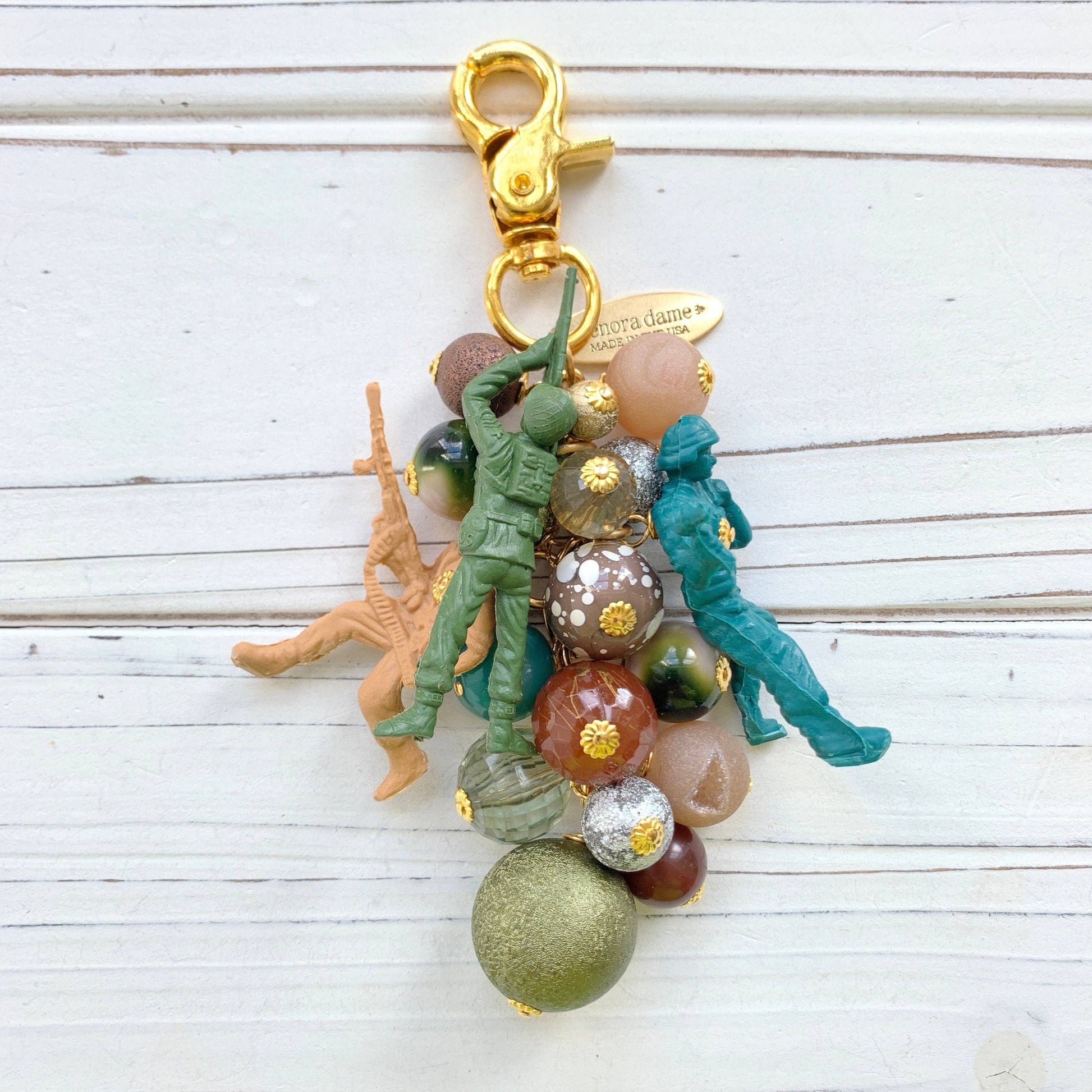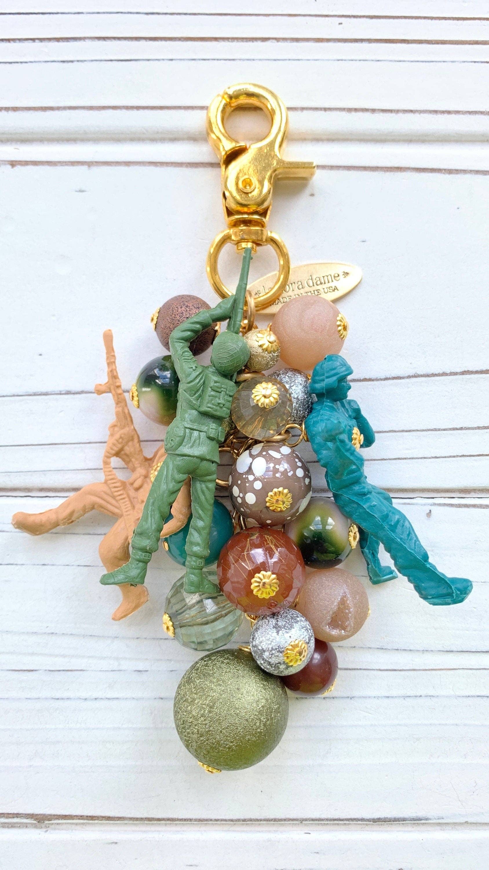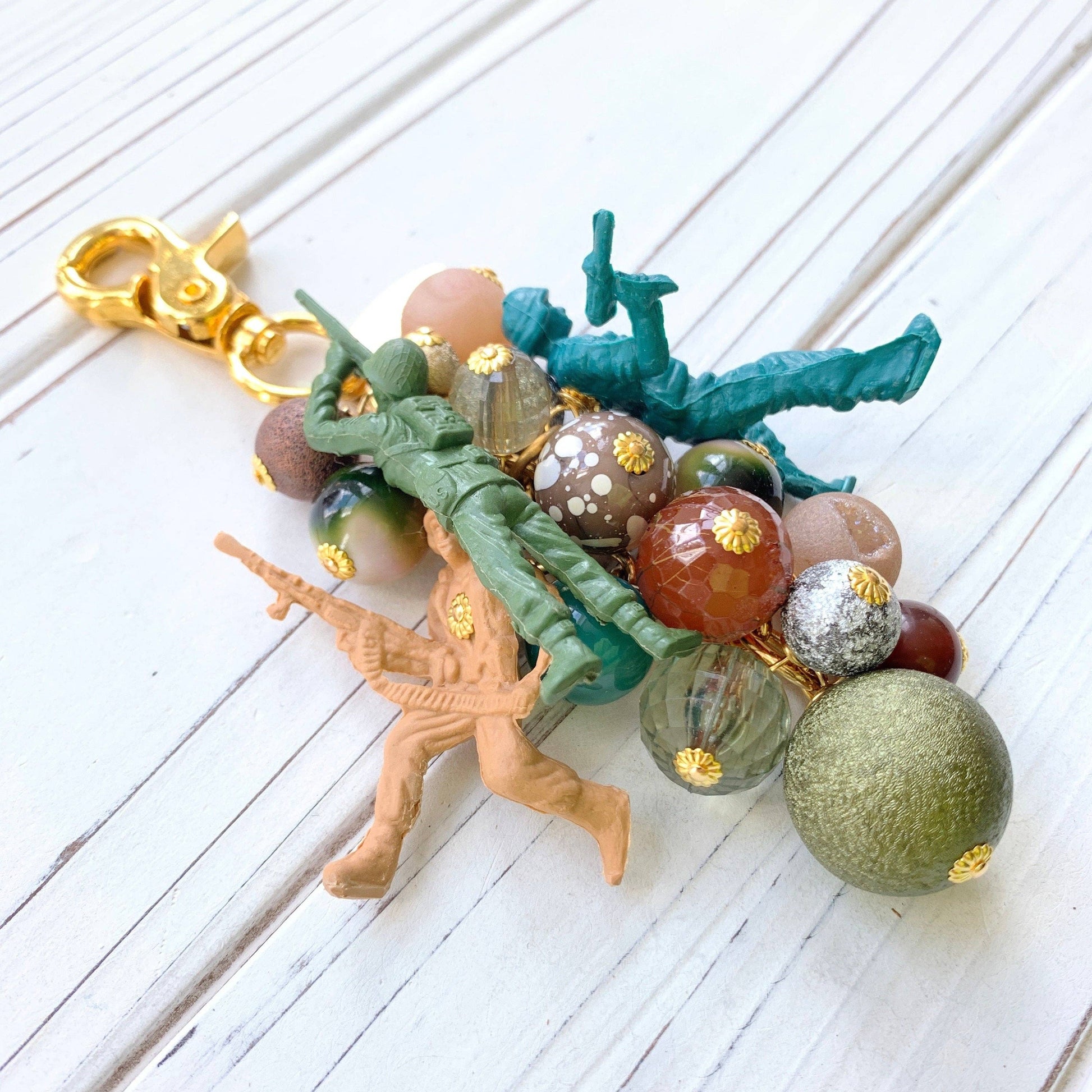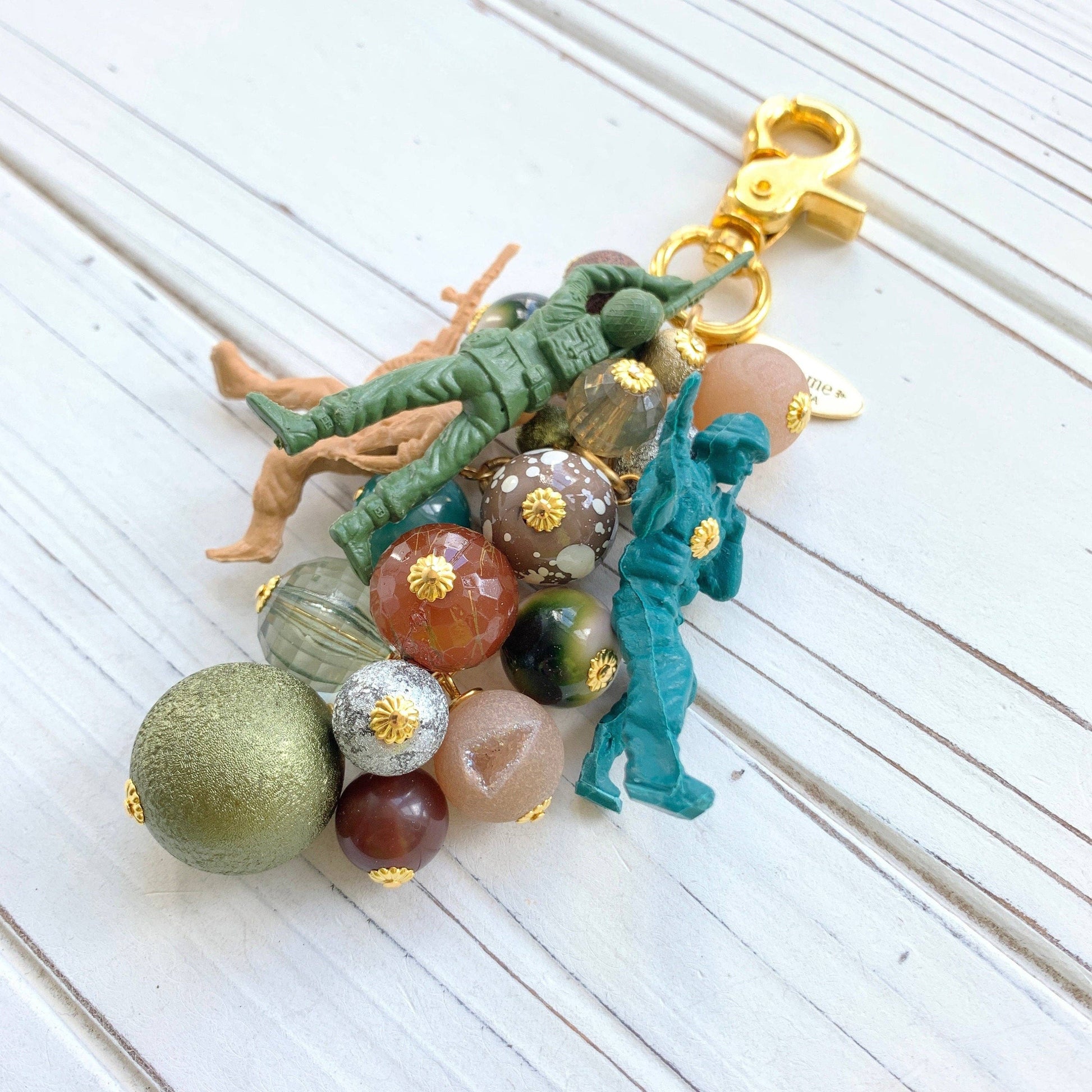 Three tiny green soldiers stand at attention among earth-toned beads in glass, acrylic, and textured finishes—each securely wire-wrapped to a sturdy gold-plated chain with a trigger clasp.