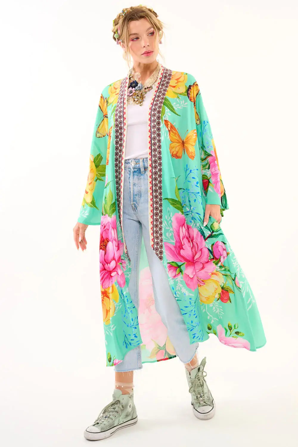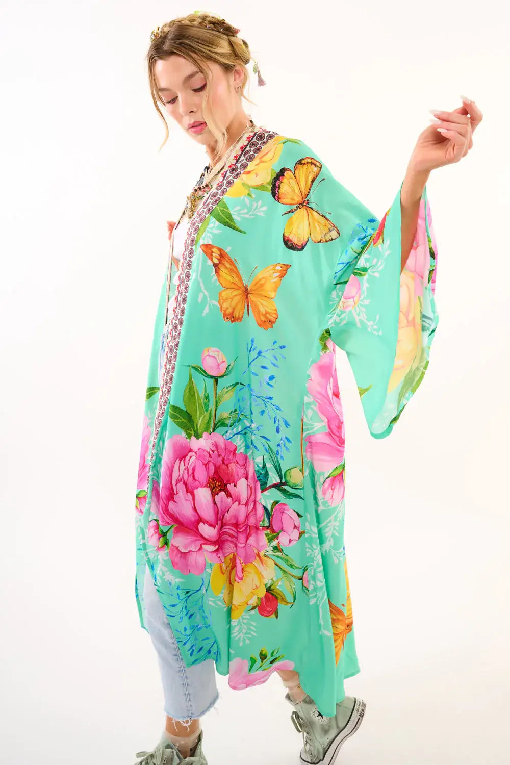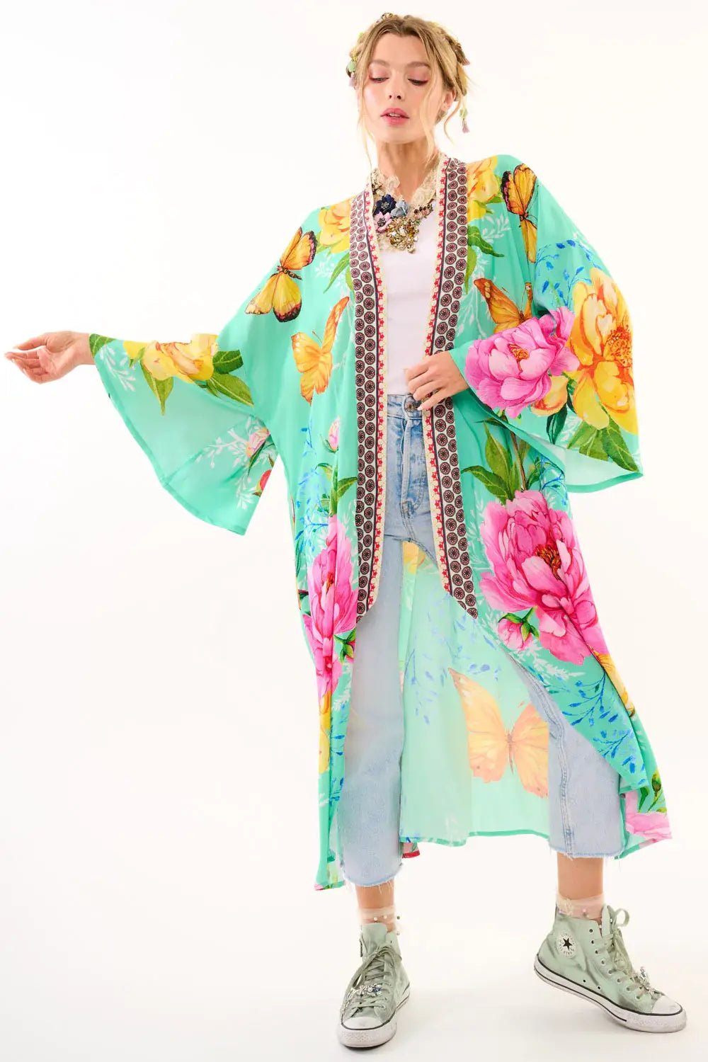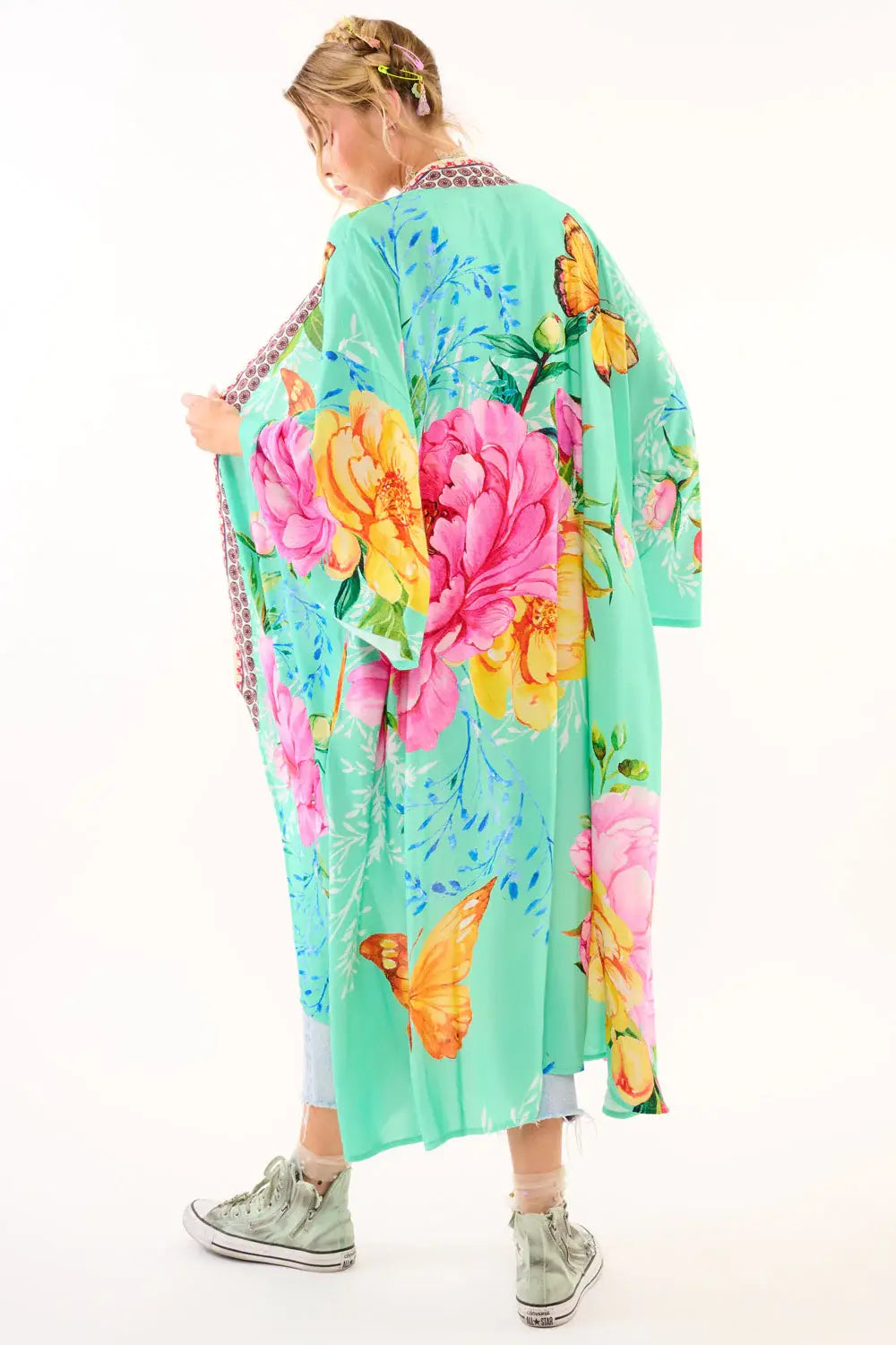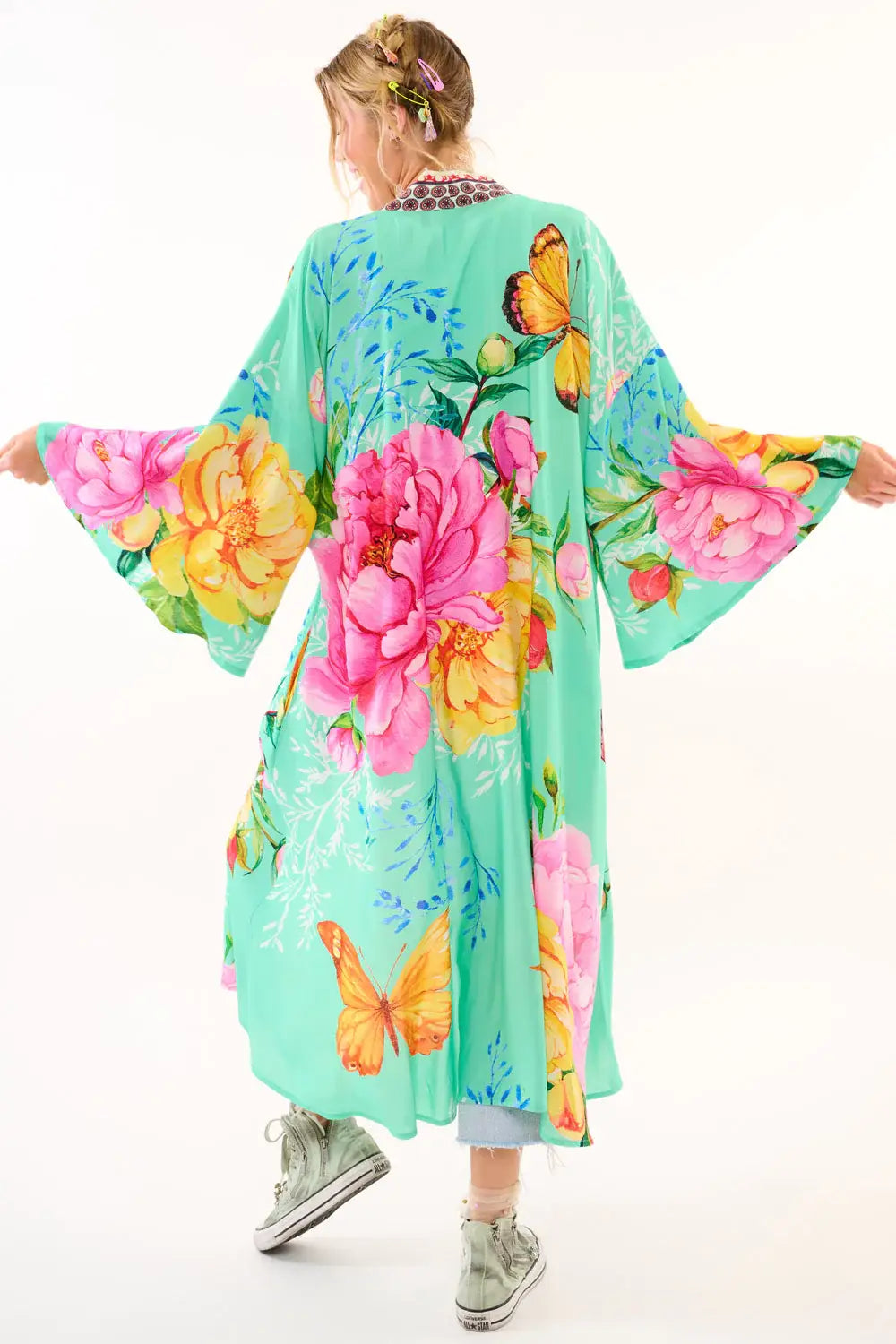 A swirl of blossoms and butterflies, this teal dream of a kimono is made for your midlife metamorphosis. With flared sleeves, deep side pockets (praise be), and a floral contrast trim that adds just the right amount of drama, this wearable garden capelet is a statement of freedom, joy, and your ever-blooming spirit.
