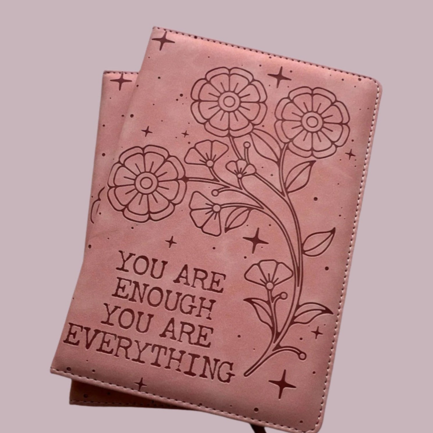 A daily reminder that you are more than enough. This beautifully crafted vegan journal is the perfect companion for capturing your thoughts, dreams, and inspirations whenever they strike.