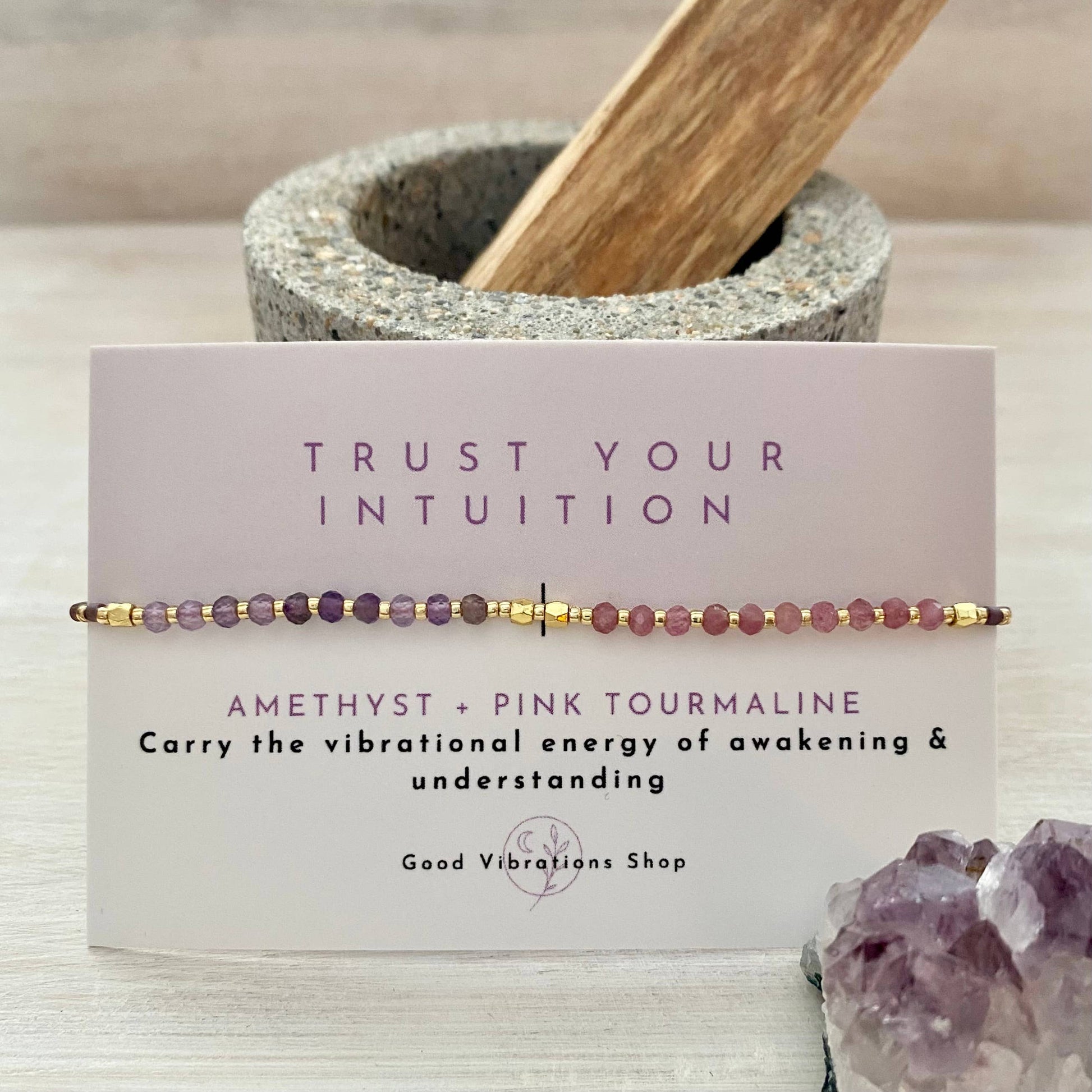 - Adjustable intention bracelet featuring Amethyst + Pink Tourmaline gemstones